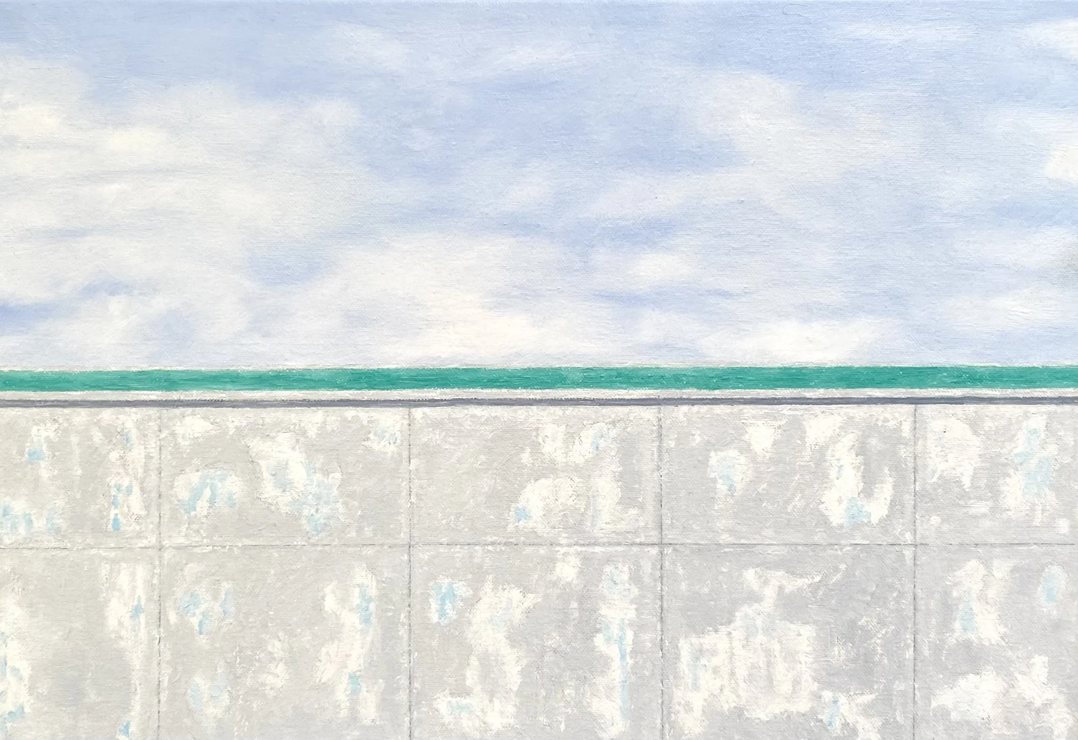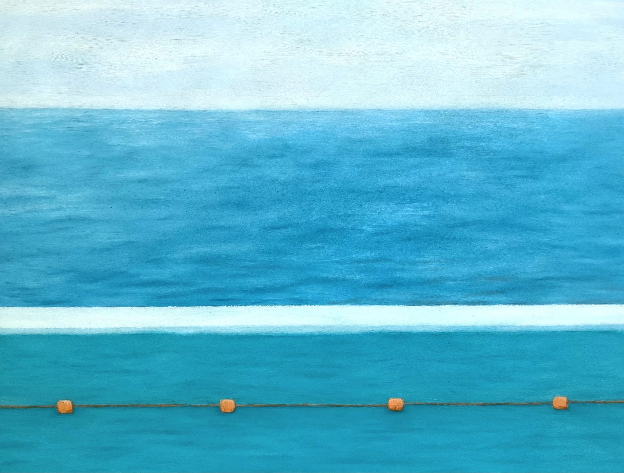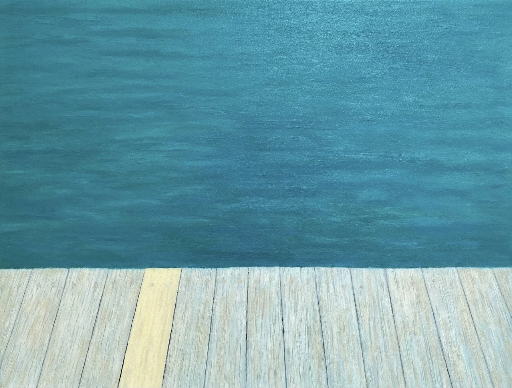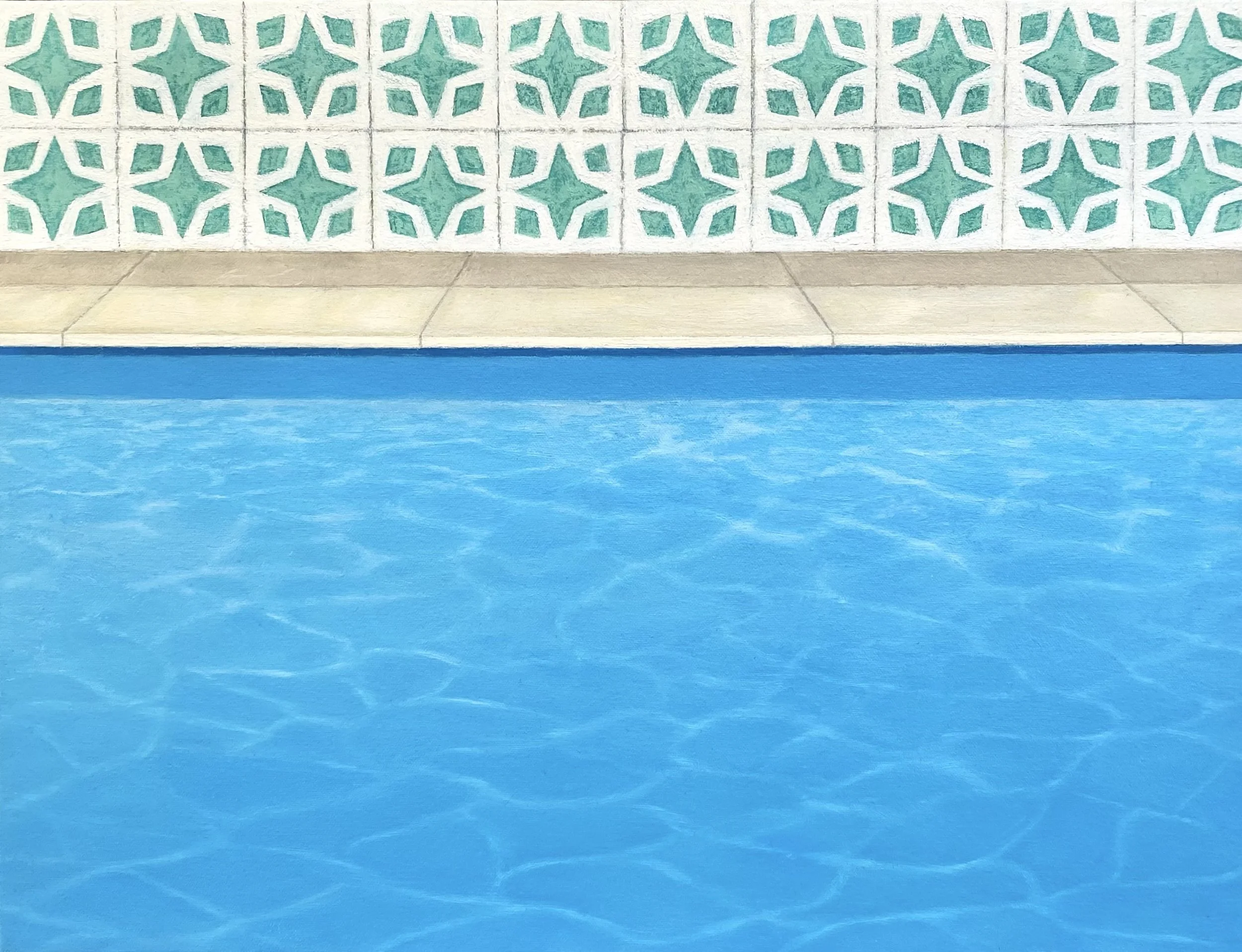 “In my recent paintings, I’ve sought to capture the things that excite me visually in a more realistic and textural way, while still holding onto the simple geometric forms and calming colour palettes of my earlier abstract works. I was first drawn to swimming pools with their hard, defined edges contrasted against the fluid sparkle of blue water. The clean simple lines of pavers, the play of shadows on solid concrete walls, and the soft distortion of black lines beneath the surface all fascinated me. I wanted to capture that moment of standing at the pool’s edge, gazing down into the cool blue depths before diving in.