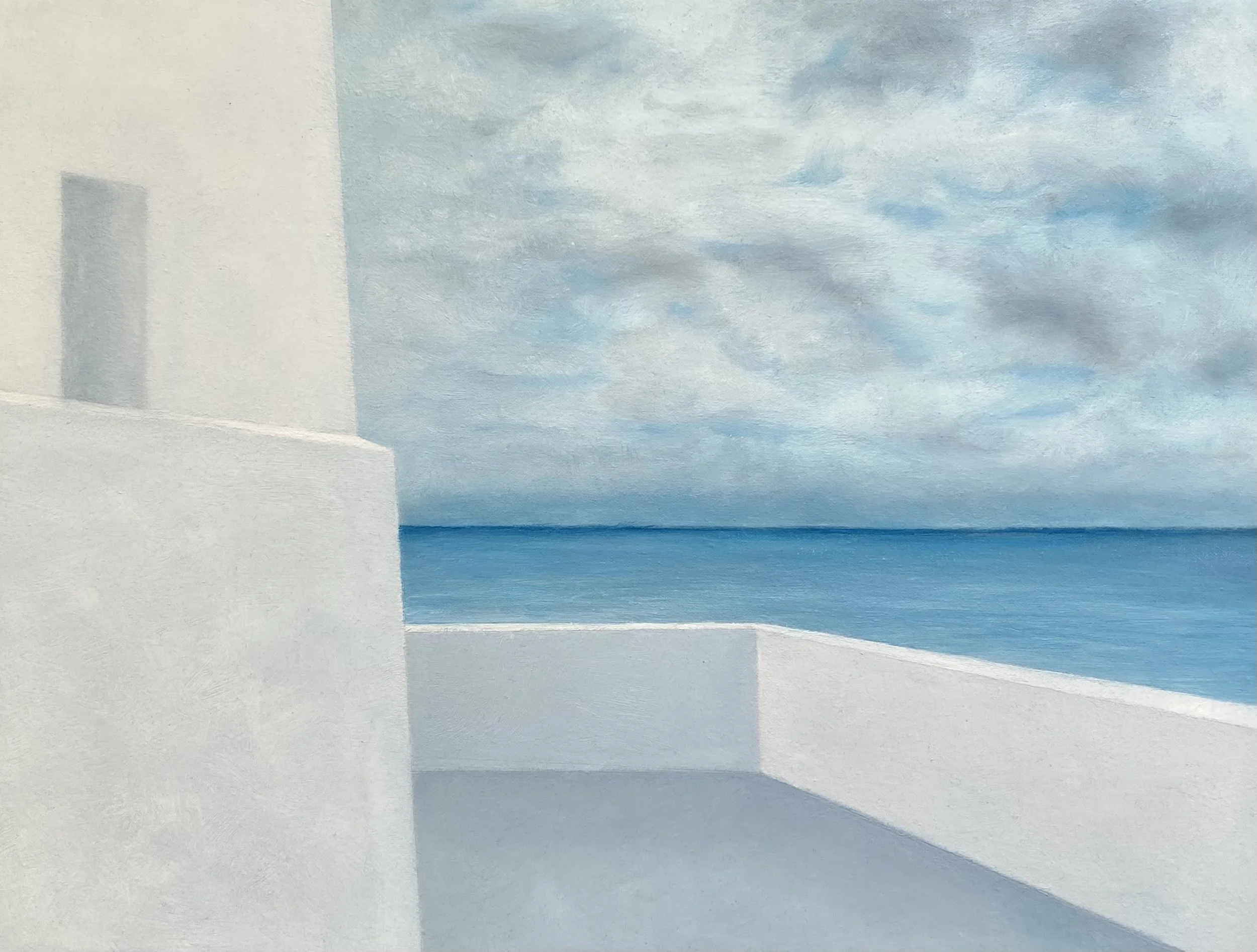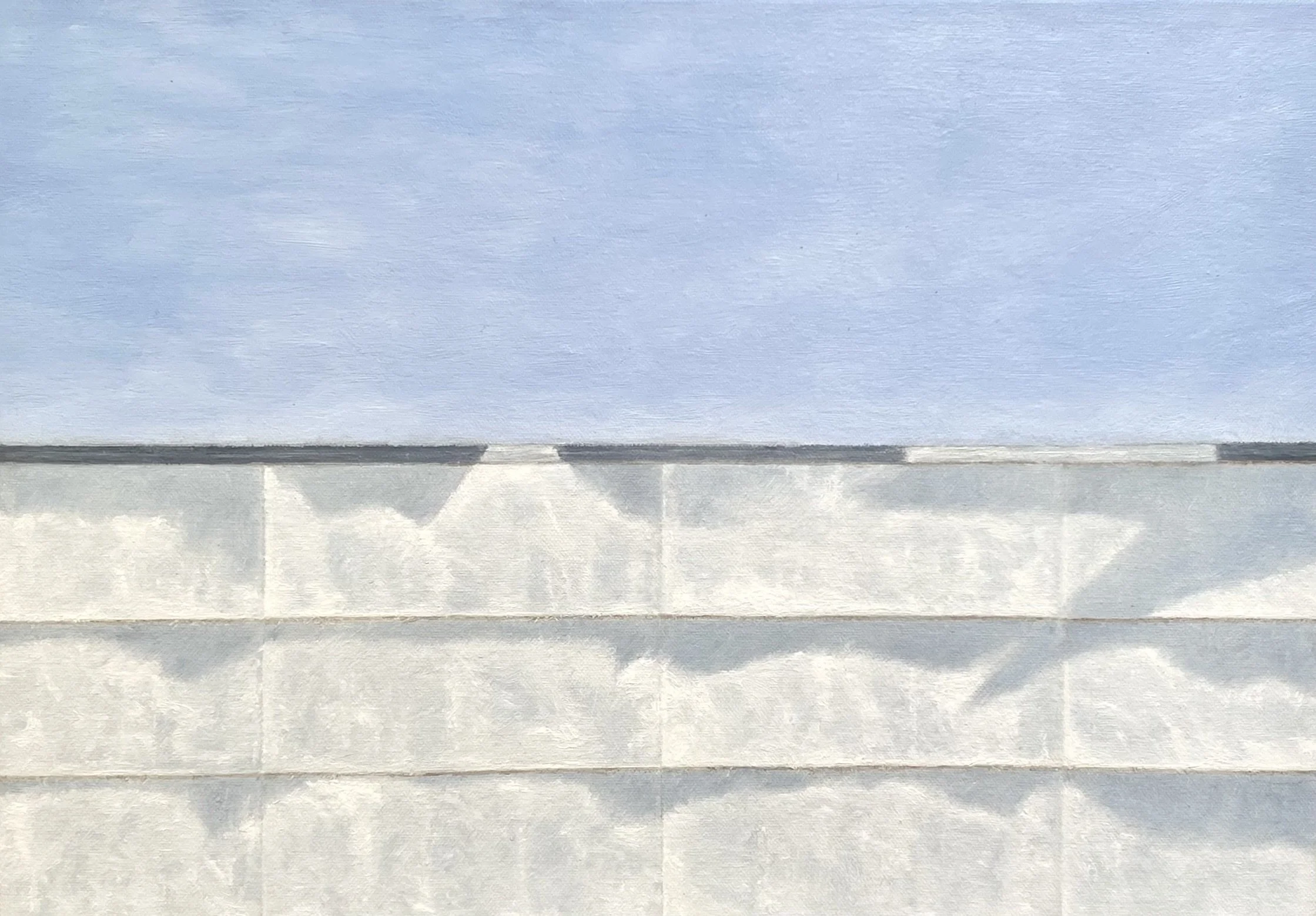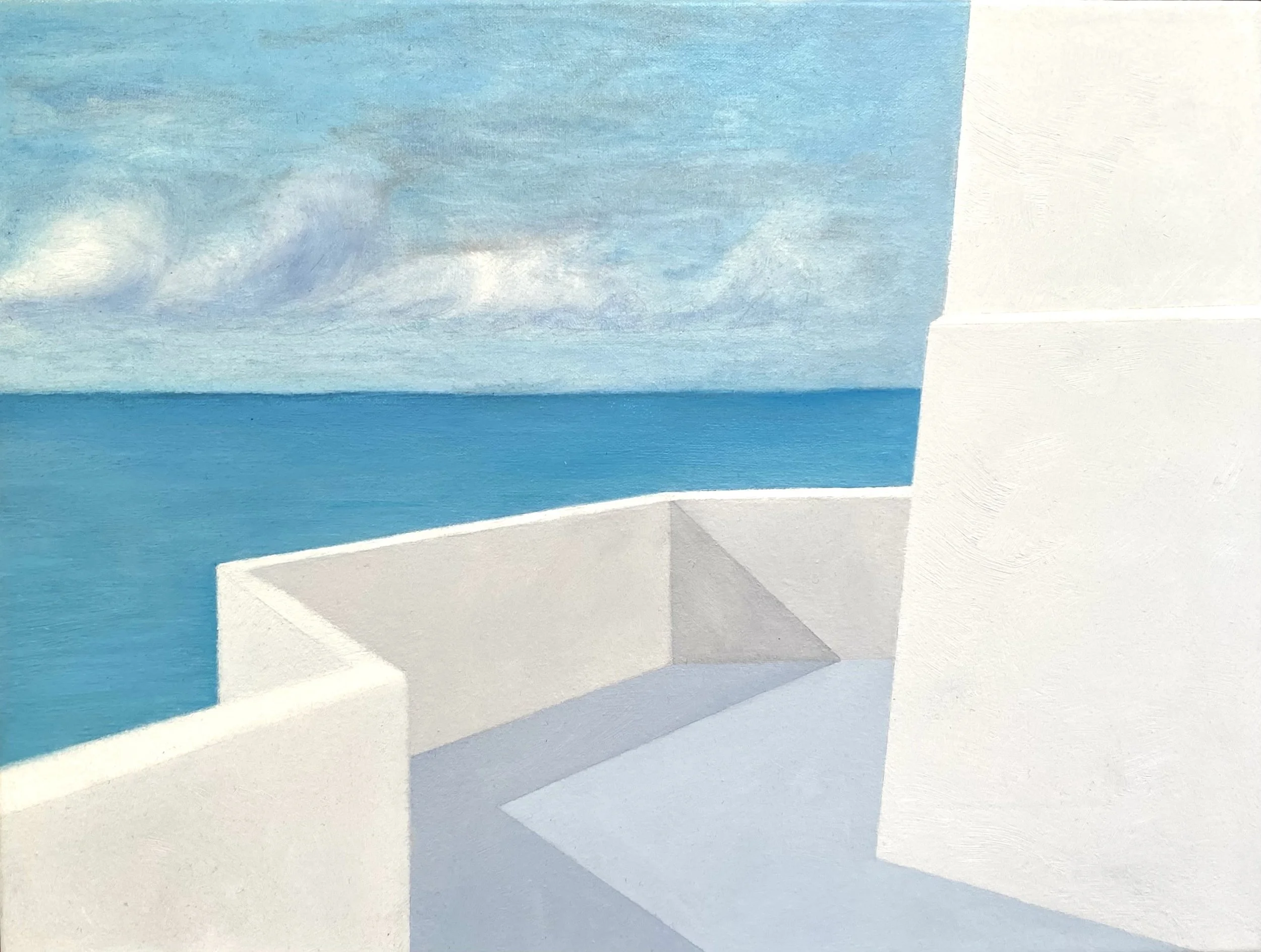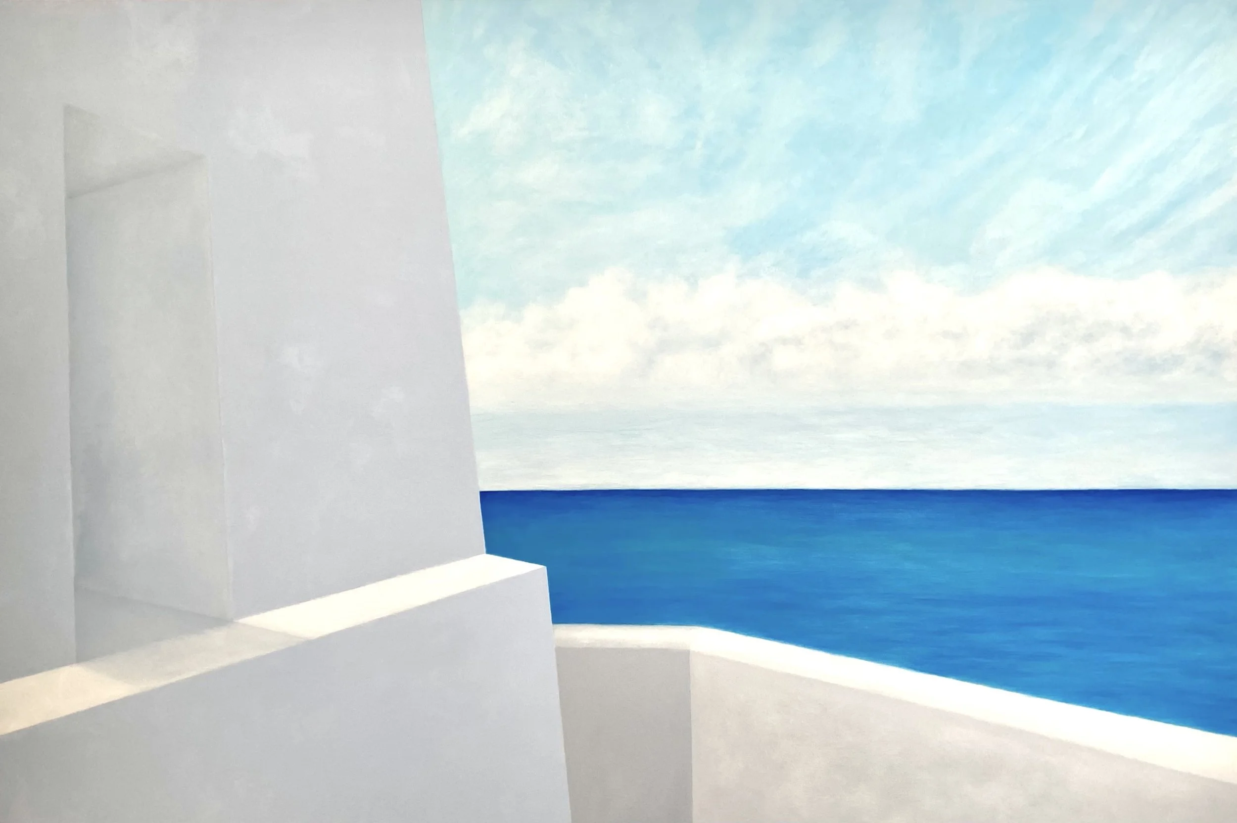 “In my recent paintings, I’ve sought to capture the things that excite me visually in a more realistic and textural way, while still holding onto the simple geometric forms and calming colour palettes of my earlier abstract works. I was first drawn to swimming pools with their hard, defined edges contrasted against the fluid sparkle of blue water. The clean simple lines of pavers, the play of shadows on solid concrete walls, and the soft distortion of black lines beneath the surface all fascinated me. I wanted to capture that moment of standing at the pool’s edge, gazing down into the cool blue depths before diving in.